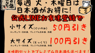 毎週火曜日と木曜日は日本酒がお得に飲める日開催です。