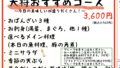 大変申し訳ございません。一部のメニューの価格を改定させていただきました。また、今回新たに「お昼のミニコース」を始めさせていただきます。おなじみの内容に加え、天ぷら、茶碗蒸しなどあらたな料理も。最後にコーヒー、アイスクリームもついて2500円...