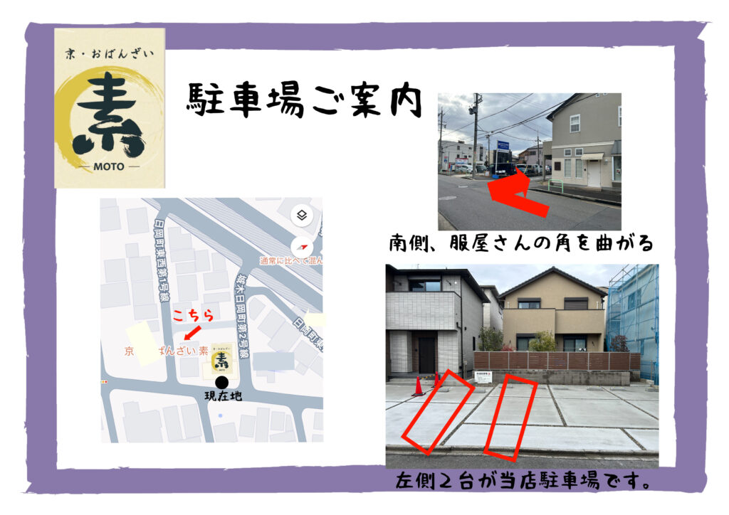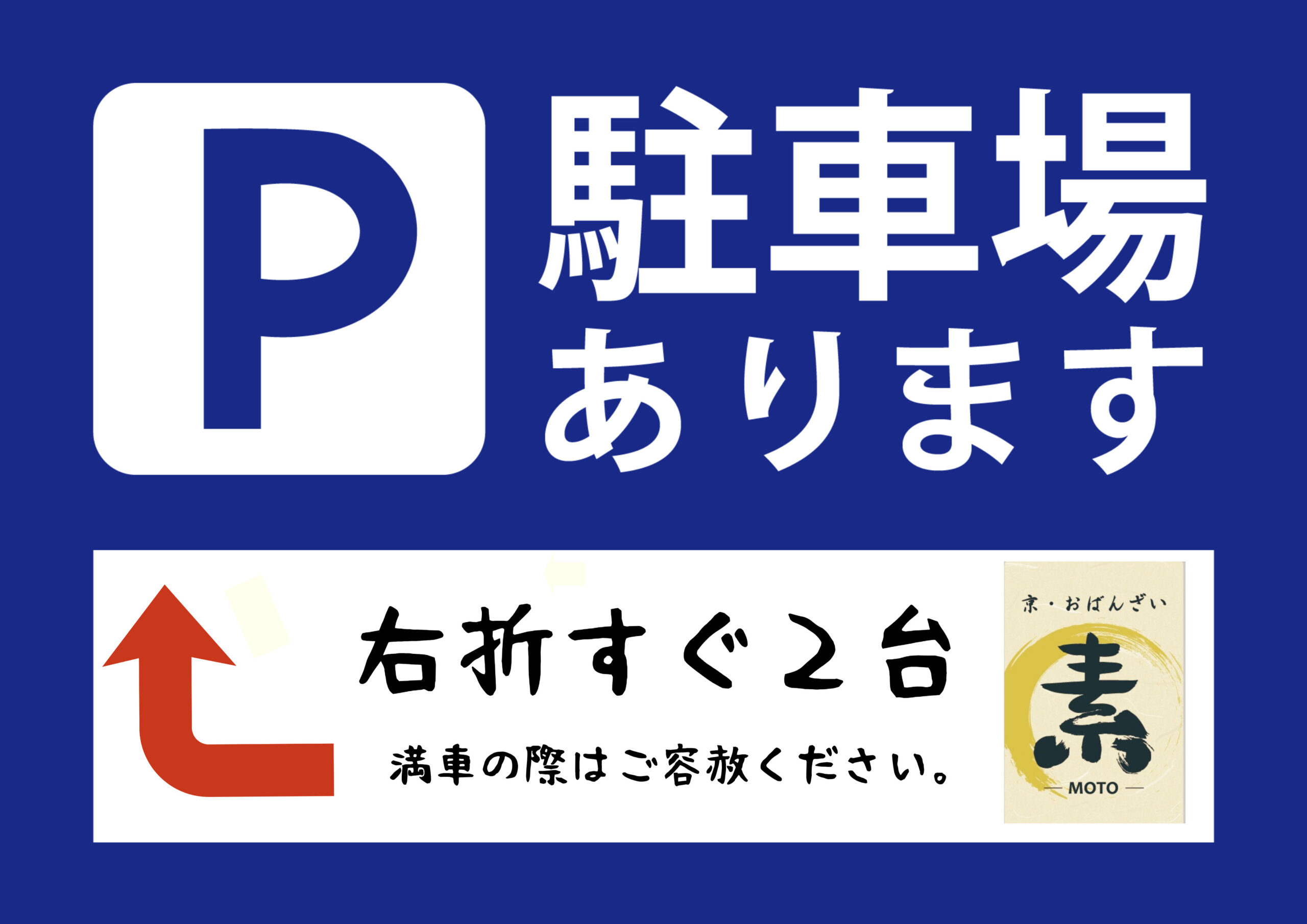 駐車場2台ございます! メニュー 2026.02.19 当店専用駐車場を2台分確保できました。 場所は当店南側、服屋さんを入ったところです。 「京・おばんざい素 お客様駐車場」と書かれた 札がありますのでそちらにお願いいたします。